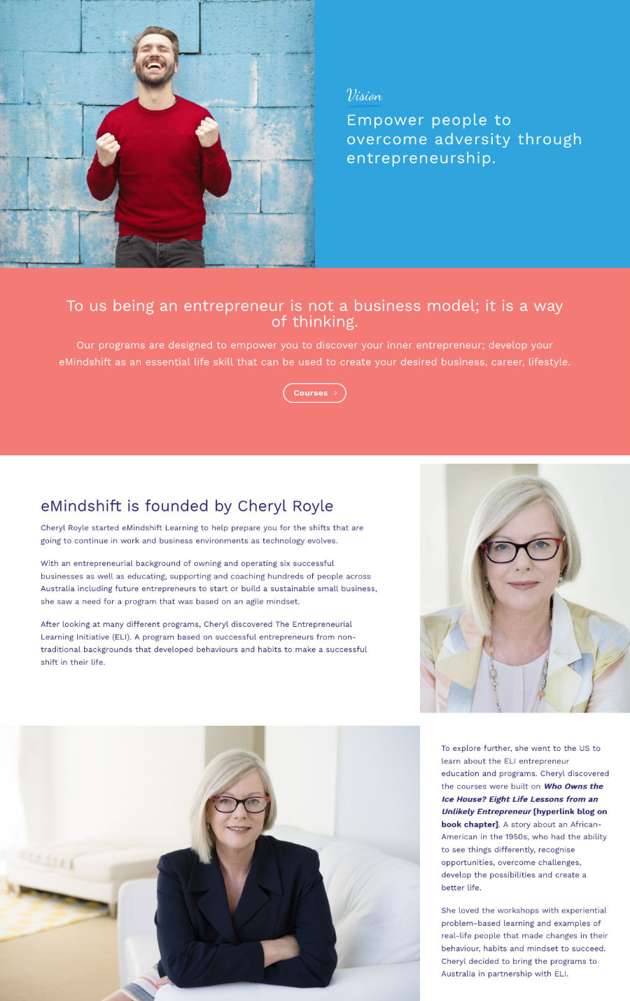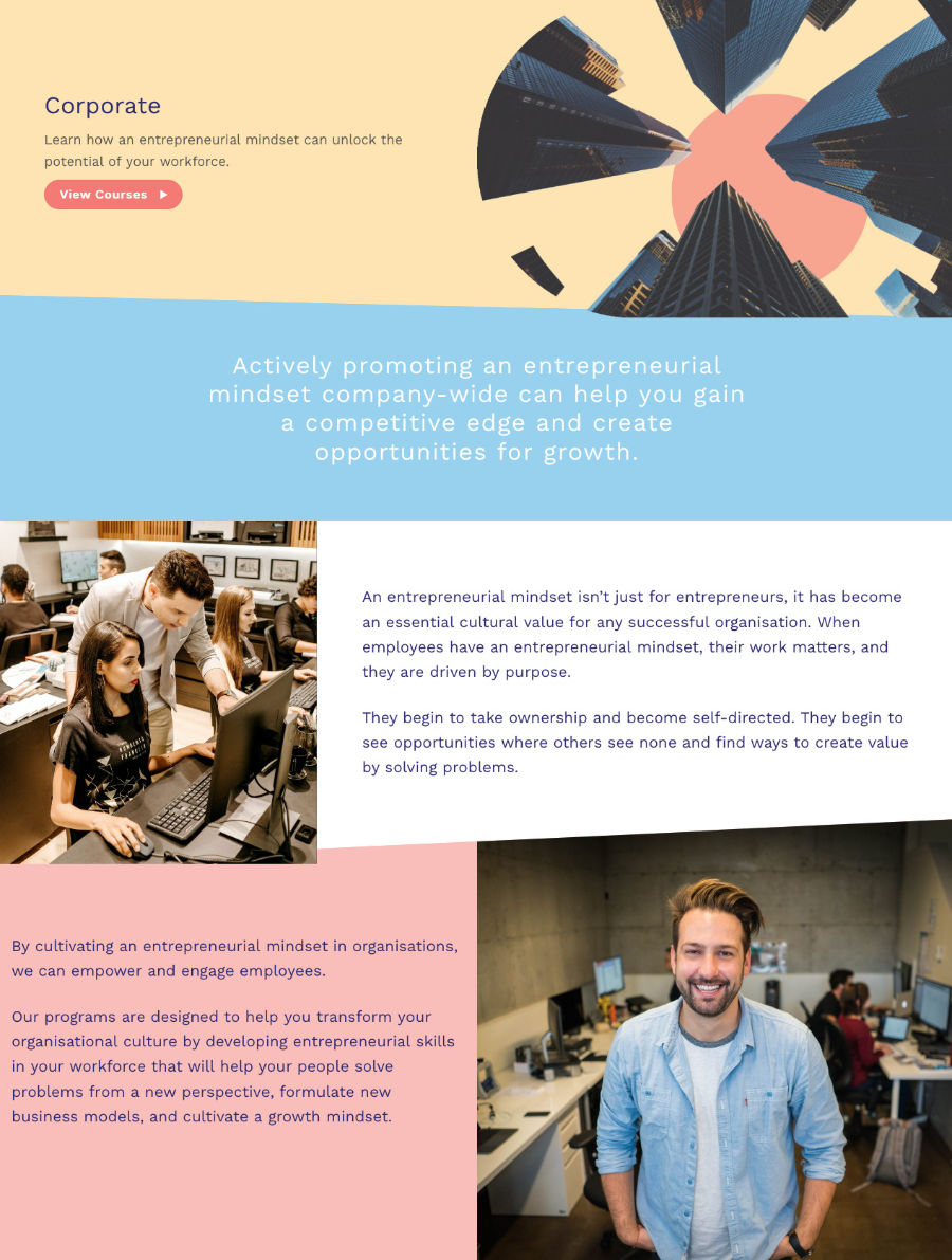 Website: Design and build website using WordPress, showcasing courses and expected outcomes of a new way to think about entrepreneurship.